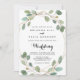 Este convite de casamento para eucalipto e frente geométrico é perfeito para um casamento rústico. A design apresenta galhos botânicos verdes de eucalipto, desenhados à mão, e folhas enfeitando uma elegante armação de ouro. Salve o papel, incluindo mais detalhes na parte traseira do convite em vez de em uma placa de gabinete separada.