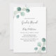 Gênero elegante revela convite com um simples design com aquarela pintada de eucalipto verde no canto superior esquerdo e canto inferior direito. A parte de trás é uma sombra correspondente de verde médio. Este gênero botânico rústico revela convite com uma reviravolta moderna é excelente para uma celebração de primavera ou verão.