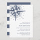O chá de panela chic costeiro apresenta uma ilustração de rosa de bússola náutica desenhada à mão em azul-porto, com os detalhes do seu chá de panela em azul-marinho clássico. Perfeito para chás de panela de praia, verão ou temas náuticos, esses convites de estilo costeiro se revertem para amplas faixas horizontais em azul e branco do porto.