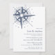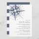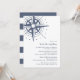 O convite de janto de ensaio técnico costeiro apresenta uma ilustração de bússola náutica desenhada à mão, com os detalhes do janto de ensaio em azul-marinho clássico. Perfeito para praia, verão, ou ensaios e celebrações náuticas, esses convites de estilo costeiro se revertem a grandes faixas azuis e brancas. Inclui espaço para o ensaio de cerimônia e para o janto ou celebração a seguir.