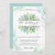 Convite de casamento elegante e único, com um requintado fundo de aquarela em turquesa, aqua, azul empoeirado e tons verdes suaves. Verde botânico atrativo no centro em tons azuis, verdes, sábios e verdes limões claros. Dourados detalhes nas folhas e nos punhos de areia. Elementos modernos de caligrafia escrita à mão. De volta em um tom elegante de água turquesa. Parte da nossa coleção "Airy Blue and Green Watercolor" com vários produtos de coordenação.