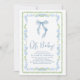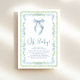 Um convite para chá encantador e bonito para bebês, com quadros verdes e azuis de cor azul inspirados na safra, uma arco azul de coquete, "Oh Baby", mostrada em um roteiro azul-chic, e o nome da futura mãe e os detalhes do chá na tipografia serif clássica.
