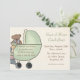 Convite não sexista do chá de fraldas com carruagem de bebê bonito do verde do urso de ursinho no fundo tan. Os convites são fáceis de personalizar e vir completo com os envelopes e a sua escolha do papel.