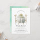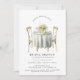 Convites de brunch de chá de panela bonito, com ilustração aquosa de uma mesa e cadeiras de rico. O verso é um fundo de aquarela abstrato com vários tons de verde.