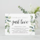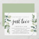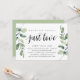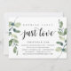 Cartão de convite temático moderno e rústico com eucalipto verde, e letra cursiva preta (com título do cartão: Nada sofisticado, apenas amor). É perfeito para o seu casamento íntimo / recepção de celebração pós-casamento. Adicione seus detalhes em fonte preta correspondente.