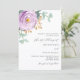 Um fundo branco. Decorados com flores violetas, roxas, flores rosas e folhas verdes de eucalipto de cor aquosa, galhos, verde e borras de ouro falsas. Personalize e adicione seus nomes e detalhes. Voltar: adicione o URL do seu site de casamento ao código QR para obter detalhes e/ou RSVP.