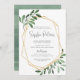 Os bonitos convites para bebês neutros em termos de gênero incluem a inscrição de cinzas enquadrada por uma falsa borda geométrica dourada e folhagem verde-escura, folhas e bagas brancas. Uma escolha moderna num esquema natural de cores para os chás de fraldas do tipo boho ou da natureza.