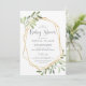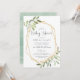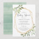 Os bonitos convites para bebês neutros em termos de gênero incluem a inscrição em cinzas enquadrada por uma falsa borda geométrica dourada e folhagem verde-clara, folhas e bagas brancas. Uma escolha moderna num esquema natural de cores para os chás de fraldas do tipo boho ou da natureza.