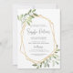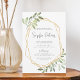 Os bonitos convites para bebês neutros em termos de gênero incluem a inscrição em cinzas enquadrada por uma falsa borda geométrica dourada e folhagem verde-clara, folhas e bagas brancas. Uma escolha moderna num esquema natural de cores para os chás de fraldas do tipo boho ou da natureza.