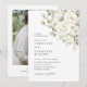 Um convite de casamento romântico em verde sage e floral branco com um design de foto na parte de trás elegante.