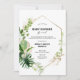 Quer você não consiga se reunir para uma festa devido a diretrizes de distanciamento social coronavírus, ou familiares e amigos distantes estão muito longe, este belo convite por correio permitirá que os entes queridos celebrem seu novo bebê de qualquer lugar. A design apresenta uma moda geométrica dourada moderna, limitada por folhas tropicais exuberantes e verde. O lado inverso tem uma coordenação de lavagem de aquarela de menta macia. As cores neutras do gênero são perfeitas para o bebê ou a menina. Use as ferramentas de design para adicionar os detalhes do chá de fraldas virtual ou personalizar para se adequar ao seu evento.