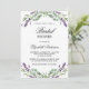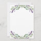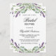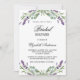 Um fundo branco. Decorado com flores de lavanda violeta e verde de eucalipto. Personalize e adicione um nome e detalhes da parte. O nome é escrito com um script de estilo manuscrito