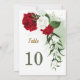 flores vermelhas e brancas com algumas folhas verdes e cartão de número de mesa reluzente