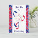 Este convite para o casamento é decorado com um buquê de noiva e bares vermelhos, brancos e azuis, molhados em fundo branco.