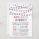 Celebre em estilo com essa tendência de 4 de julho que o gênero revela convites de festas. O design apresenta luzes de cadeia vermelha e azul suspensas com texto simples de editar em um simples fundo branco.