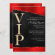Este convite de evento ou festa VIP personalizado apresenta um tema glamouroso vermelho e dourado. O fundo tem um padrão de gradiente de folha de alumínio preta no centro, com folha vermelha brilhante e lágrimas de abstrato reluzente vermelha na parte superior e inferior. O título do VIP é impresso verticalmente à esquerda, em uma fonte grande de brilho dourado.