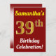 Este design de convite de aniversário apresenta uma mensagem como "Samantha's 39th Birthday Celebration!", onde o nome pode ser personalizado, e onde o número "39th" tem uma aparência de ouro falso. Ele também apresenta um fundo de cor vermelha. Os detalhes do evento no verso podem ser personalizados. Poderia ser usado para convidar pessoas para a festa ou festa de aniversário de trinta e nove anos de alguém. [~Z0000120]