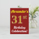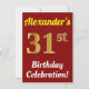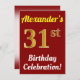 Este design convite de aniversário apresenta uma mensagem como "A 31ª Celebração de Aniversário de Alexandre!", onde o nome pode ser personalizado, e onde o número "31º" tem uma aparência falsa de ouro. Ele também apresenta um fundo de cor vermelha. Os detalhes do evento no verso podem ser personalizados. Poderia ser usado para convidar pessoas para a festa ou festa de aniversário de 30 anos de alguém. [~Z0000120]