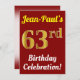 Este design convite de aniversário apresenta uma mensagem como "A 63ª Celebração de Aniversário de Jean-Paul!", onde o nome pode ser personalizado, e onde o número "63º" tem uma aparência falsa de ouro. Ele também apresenta um fundo de cor vermelha. Os detalhes do evento no verso podem ser personalizados. Poderia ser usado para convidar pessoas para a festa ou festa de aniversário de alguém do sexagésimo terceiro aniversário. [~Z0000120]
