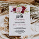 Este convite de aniversário de 50 anos de casamento tropical e romântico vermelho é perfeito para uma festa de aniversário vermelha. O design artístico bordo marsala apresenta rosas em verde, rosa, burgundy e blush, misturadas com folhagens, dispostas de forma harmoniosa e radiante em um buquê de flores.