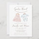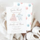 Celebre o grande revelador do seu pequeno com o nosso adorável convite de gênero de roupas de bebê! Com um belo vestido cor-de-água, cor-de-rosa, uma roupa de criança azul, e balões brancos no fundo, esta design define o tom perfeito para uma celebração doce e na moda. Perfeito para um chá de fraldas divertido e memorável!
