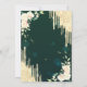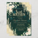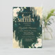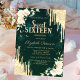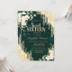 Um convite moderno, chico e glamouroso com gotas de brilho e flores em fundo verde.
