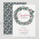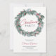 Convite de festas verde-azul-esbelto, vermelho-flor, da coroa de Natal, com folhas de cor-de-água, conchas, bagas em vermelho, rosa e verde e pinheiro azul.