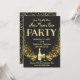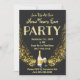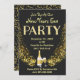 Convite de festas de véspera de ano novo. Eu desenhei este cartão com um fundo quase completamente preto. A festa é adicionada com um elemento de falso brilho, seguido de ouro, champanhe e óculos. A parte traseira da placa também tem brilho no ouro. Elegante, refinado e mínimo. Festa de vamos! Feliz ano novo. Personalizável. © Rosemarie Guieb