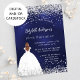 Um convite moderno, na moda e glamouroso para uma festa de aniversário 18 (ou qualquer idade). Um fundo azul marinho com brilho sujo, brilhos, uma garota vestindo um vestido de bola. A cor azul é irregular. O nome é escrito com um moderno estilo escrito à mão. Personalize e adicione os detalhes da sua festa.