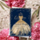 Dourada tiara, vestido e diamantes em fundo azul marinho.