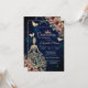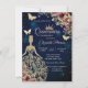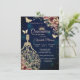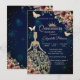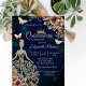 Tiaras cintilantes douradas, vestido, estrelas, borboletas e flores em um fundo azul. Convide os convidados a se juntarem a você na celebração deste marco com um design que reflete a magia e a alegria do seu quinceañera.