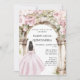 Um grande arco de mármore decorado com flores cor-de-rosa. Uma garota com um vestido de rosa claro. Personalize e adicione um nome e detalhes.
