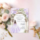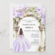 Um grande arco de mármore decorado com flores lavandas e violetas. Uma garota com um vestido lavanda e colorido. Personalize e adicione um nome e detalhes.