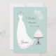 Vestido, bolo e flores brancos elegantes de casamento (em um chá de panela ciano fraco pálido do fundo do damasco de água-marinha pálida)