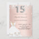 Um convite moderno, na moda e glamouroso para uma Quinceañera, festa de aniversário 15. Um fundo rosa de ouro com faíscas de prata e um vestido. O nome é escrito com um moderno estilo escrito à mão. O número 15 é escrito com um estilo de balão fon. Personalize e adicione os detalhes da sua festa.