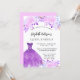Um convite moderno, na moda e glamouroso para uma Quinceañera, festa de aniversário 15. Um fundo branco com flores cor-de-rosa pinceladas, um vestido de bola roxo. O nome é escrito com um moderno estilo escrito à mão. Personalize e adicione os detalhes da sua festa.