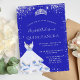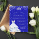Uma tendência e um convite glamouroso para uma Quinceañera, 15 festa de aniversário. Um fundo azul real com poeira cintilante de prata falsa, uma tiara e um vestido. O nome é escrito com um moderno estilo escrito à mão. Personalize e adicione os detalhes da sua festa.