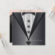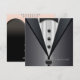 Convite de smoking preto elegante com camisa branca e gravata borboleta preta na frente e um vestido preto sem alças com colar de diamantes no verso. Este é um modelo de convite de festa ou evento versátil para qualquer festa ou ocasião especial. O design da frente e verso também está disponível em envelopes. Convites de evento de black tie preto, convites de festa corporativos, convites de festa de aniversário, coquetel de festa, jantar, convites de festa de casamento, convites de festa de noivado.