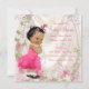Convite de chá de bebê para menina étnica com adorável bebê vestindo um vestido rosa com folhos e uma linda gargantilha de pérolas com meias brancas e sapatos Mary Jane pretos em um fundo floral de cetim rosa brilhante. Este convite de chá de bebê rosa e marfim é facilmente personalizado para o seu evento, basta adicionar seus detalhes no estilo de letra, cor e texto de sua preferência. Este é um design impresso sem brilho, fitas, etc. reais.