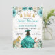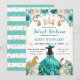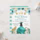 Um convite turquesa impressionante com tema ocidental para Sweet Sixteen, apresentando uma linda princesa morena com um vestido de baile azul-esverdeado fluído e chapéu ocidental, cercada por rosas azul-esverdeadas, borboletas, folhagens suaves e sotaques dourados cintilantes. Elementos chiques do oeste, como a silhueta do cavalo dourado e ferradura cintilante, adicionam um toque divertido e elegante, mantendo o design sofisticado e comemorativo. Uma coroa dourada régia destaca a parte superior do layout, enquanto a tipografia moderna com fontes mistas apresenta os detalhes do marco com um toque feminino e polido. A rica paleta turquesa, o brilho dourado quente e a silhueta graciosa da princesa criam um convite de celebração de Sweet 16 luxuoso e ines