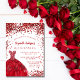 Um convite moderno, na moda e glamouroso para uma Quinceañera, festa de aniversário 15. Um fundo branco com confete, um vestido vermelho. O nome é escrito com um moderno estilo escrito à mão. Personalize e adicione os detalhes da sua festa.