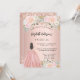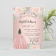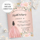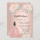 Um convite moderno, na moda e glamouroso para uma doce festa de aniversário 16, 16. Um fundo rosa de ouro com flores cor-de-rosa pinceladas, uma garota vestindo um vestido de bola. O nome é escrito com um moderno estilo escrito à mão. Personalize e adicione os detalhes da sua festa.