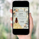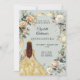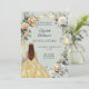 Um fundo verde sábio. Decorados com flores brancas e amarelas, verde-sábio e uma fita de ouro. Uma garota vestindo uma tiara e um vestido. Personalize e adicione um nome e detalhes.