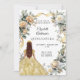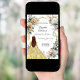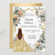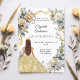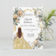 Um fundo branco. Decorados com flores brancas e amarelas, verde-sábio e uma fita de ouro. Uma garota vestindo uma tiara e um vestido. Personalize e adicione um nome e detalhes. Voltar: um fundo de ouro.