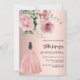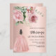 Um convite moderno, na moda e glamouroso para uma Quinceañera, festa de aniversário 15. Um fundo rosa de ouro decorado com grandes rosas cor-de-rosa e verde, uma garota vestindo um vestido de bola. O nome é escrito com um moderno estilo escrito à mão. Personalize e adicione os detalhes da sua festa.