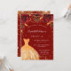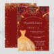 Um convite moderno, na moda e glamouroso para uma doce festa de aniversário 16, 16. Um fundo vermelho com pó de ouro falso, um vestido e rosas vermelhas, florais. O nome é escrito com um moderno estilo escrito à mão. Personalize e adicione os detalhes da sua festa.