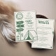 Um modelo de convite itinerário do aniversário de 30 anos, moderno, elegante e chic, com tema de acampamento, com desenhos minimalistas de uma tenda com montanhas, árvores e cartazes, posta o título, "Vamos Go Camping", e outros símbolos bonitos, desenhados à mão para um mapa e outros acampamentos (marshmallow torrado etc.). Uma opção moderna e divertida para uma mulher que faz trinta anos num glamouroso fim de semana de acampamento, caminhada ou em qualquer lugar ao ar livre, em verde florestal suave, ao ar livre e num estilo moderno minimalista.