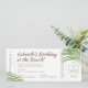 Bilhete de Avião Embarcado Passando o Tema Aniversário Convite para Aventura de Amigo de Destino Tropical. Coloque detalhes e informações de rsvp na parte traseira, ou mude para incluir outras palavras personalizadas. Fontes e cores podem ser modificadas usando o Editor de Modelo. Este Convite para Férias de Aniversário de Praia é mostrado em um tom neutro e verde com uma moderna e simples borda de palma. Outras cores e temas estão disponíveis no Compro de Destinos da Uva de Papel no Zazzle.