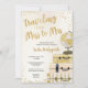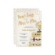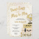 Viajando de Miss a Sra. chá de panela com uma pilha de pincel e ouro de malas tocada com um globo e realçada com confetti e um fundo de pincel mal-intencionado completo com um suporte de confete de ouro. Elementos de coordenação disponíveis. Entre em contato diretamente com o designer em info@lemontreecards.com para solicitar itens correspondentes que ainda não estão na coleção.