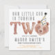 Prepare-se para festejar com este adorável convite de aniversário de "Turning Two"! Com um ursinho de peluche aquoso em um chapéu de bolinhas, um balão de ouro em forma de número 2, e uma inscrição divertida de "Festa Animal", este convite é perfeito para uma divertida comemoração de segundo aniversário da criança. Personalize com o nome do seu filho, os detalhes do evento e as informações de RSVP para criar uma manutenção única.